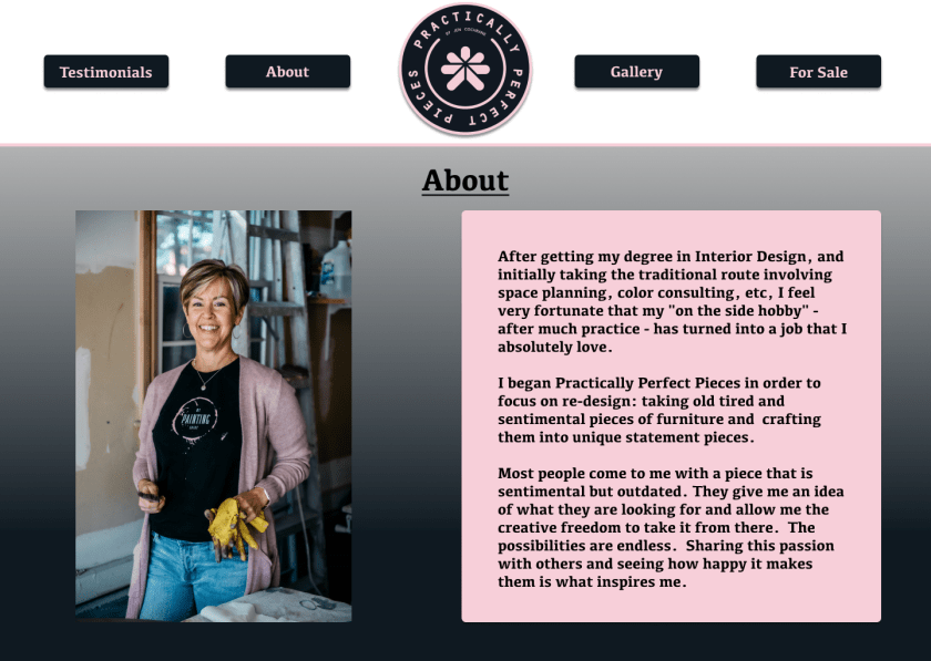 Designed in Figma and then converted to HTML/CSS code I used the established brand colors and logo to design a user friendly website that allows users to view old work, buy unclaimed pieces, view customer testimonials, and learn more about the owner Jen.